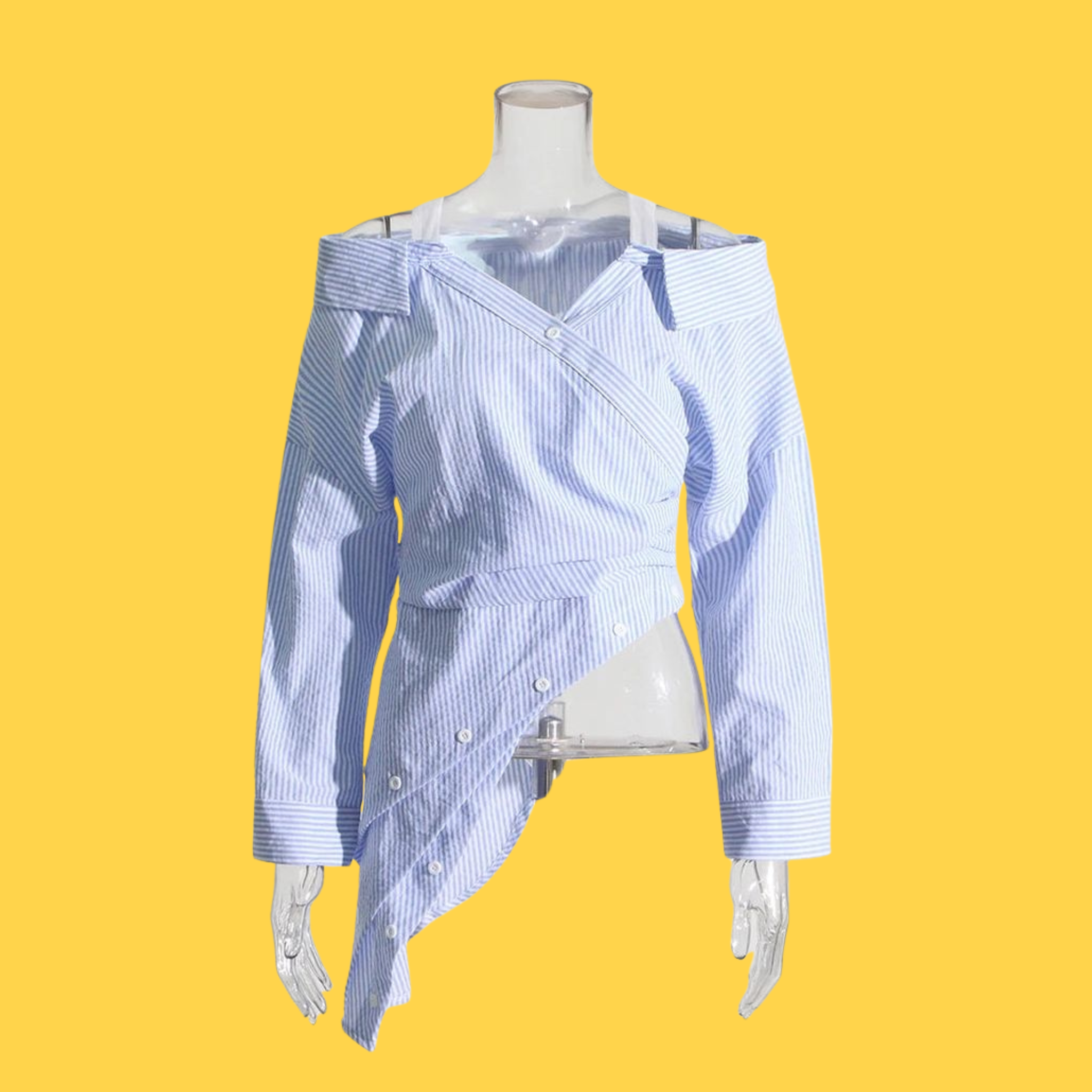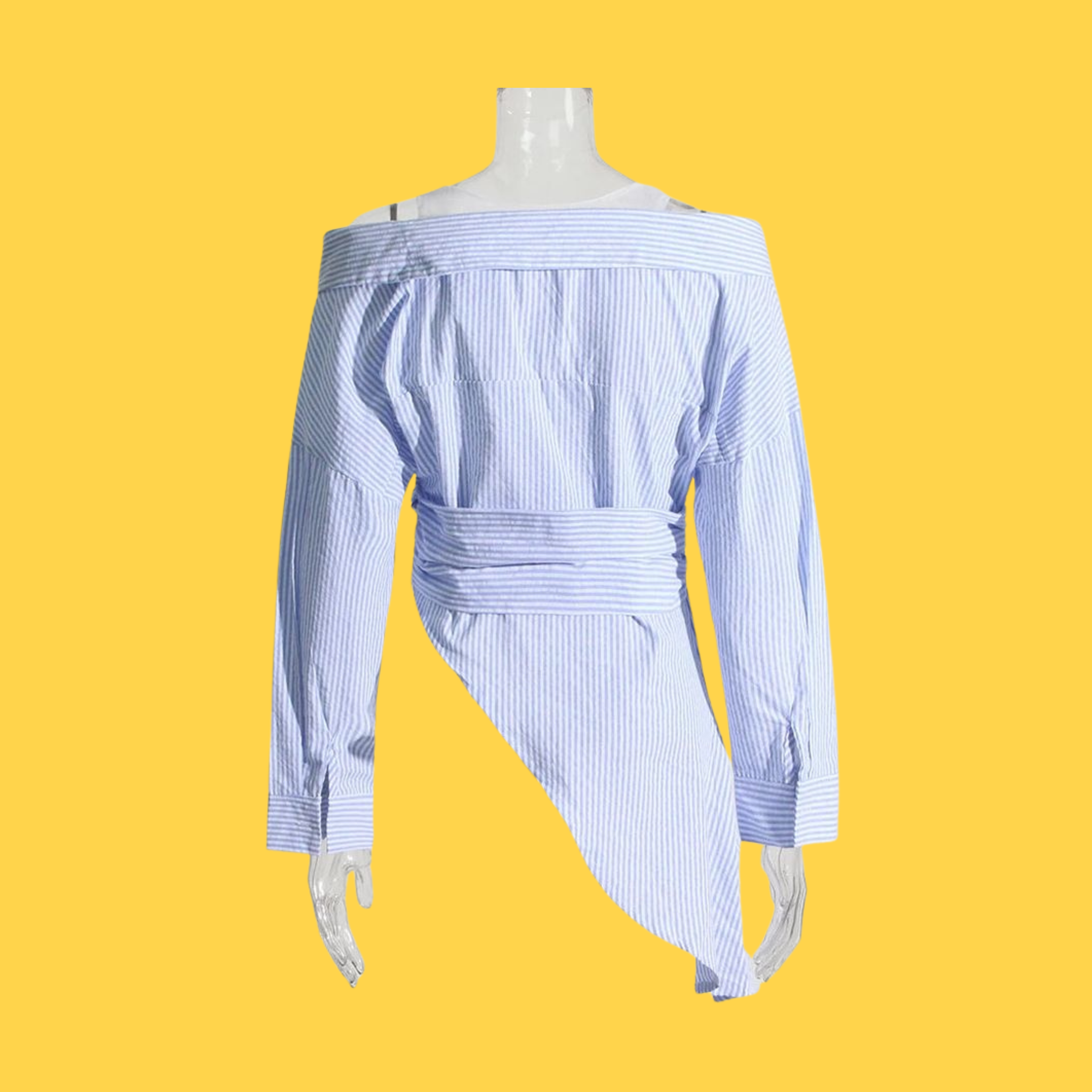 Elevate your spring wardrobe with this off-shoulder shirt featuring an eye-catching irregular neckline. The slim-waist silhouette flatters your figure while the asymmetrical design adds modern edge to your everyday look. Crafted for comfort and style, this seasonal piece brings contemporary Korean fashion to your closet. Perfect for layering or wearing solo, it's a versatile essential that transitions seamlessly from casual outings to weekend gatherings.