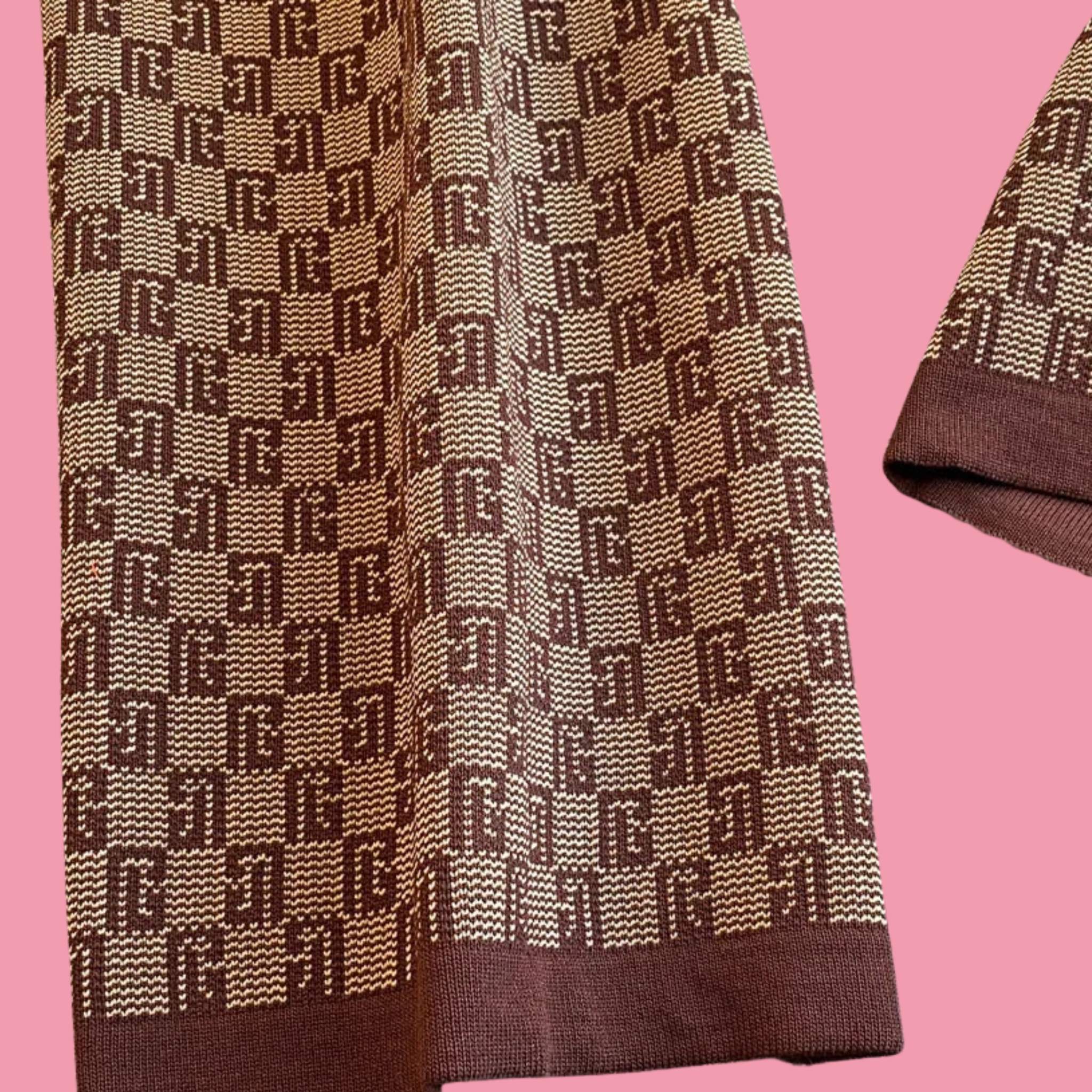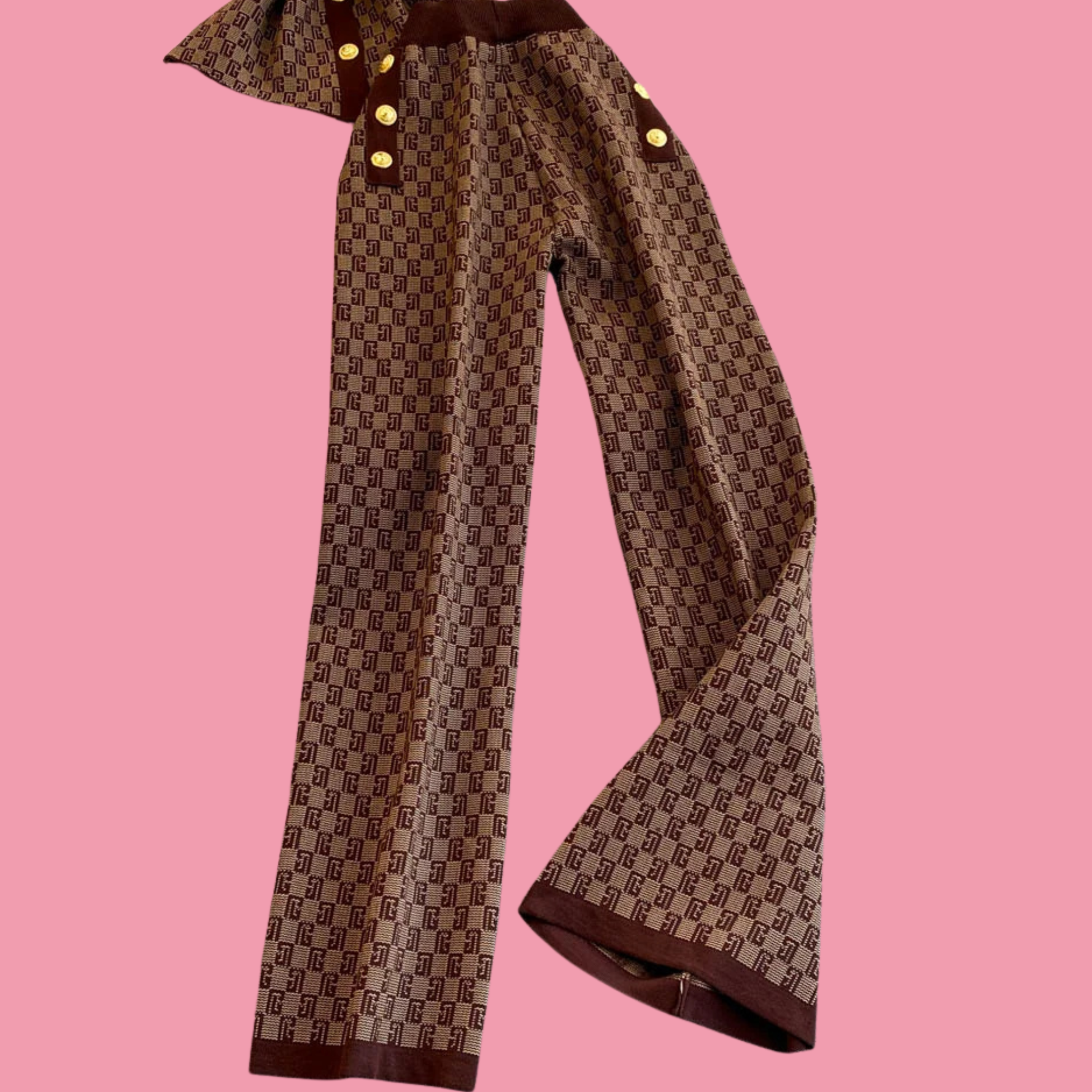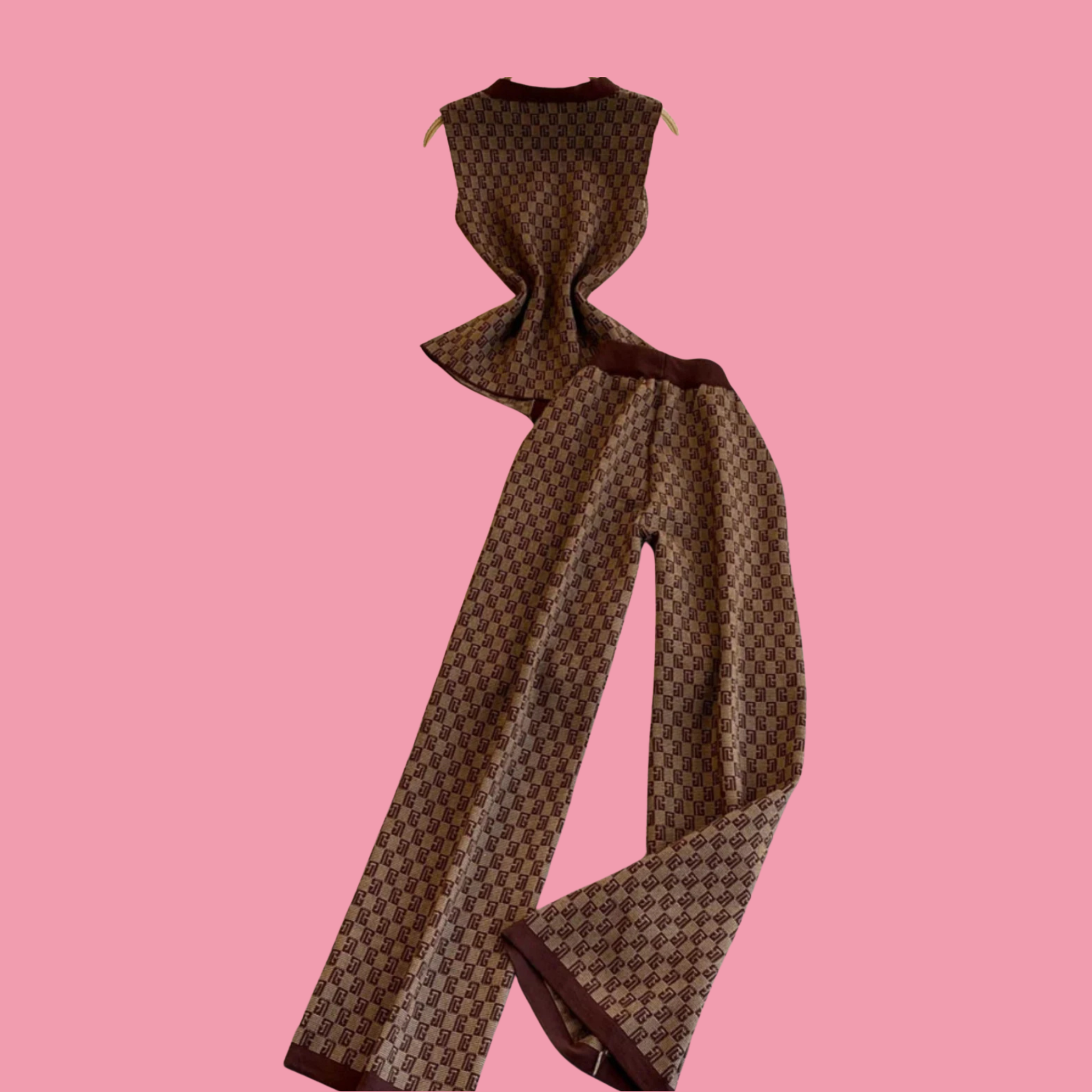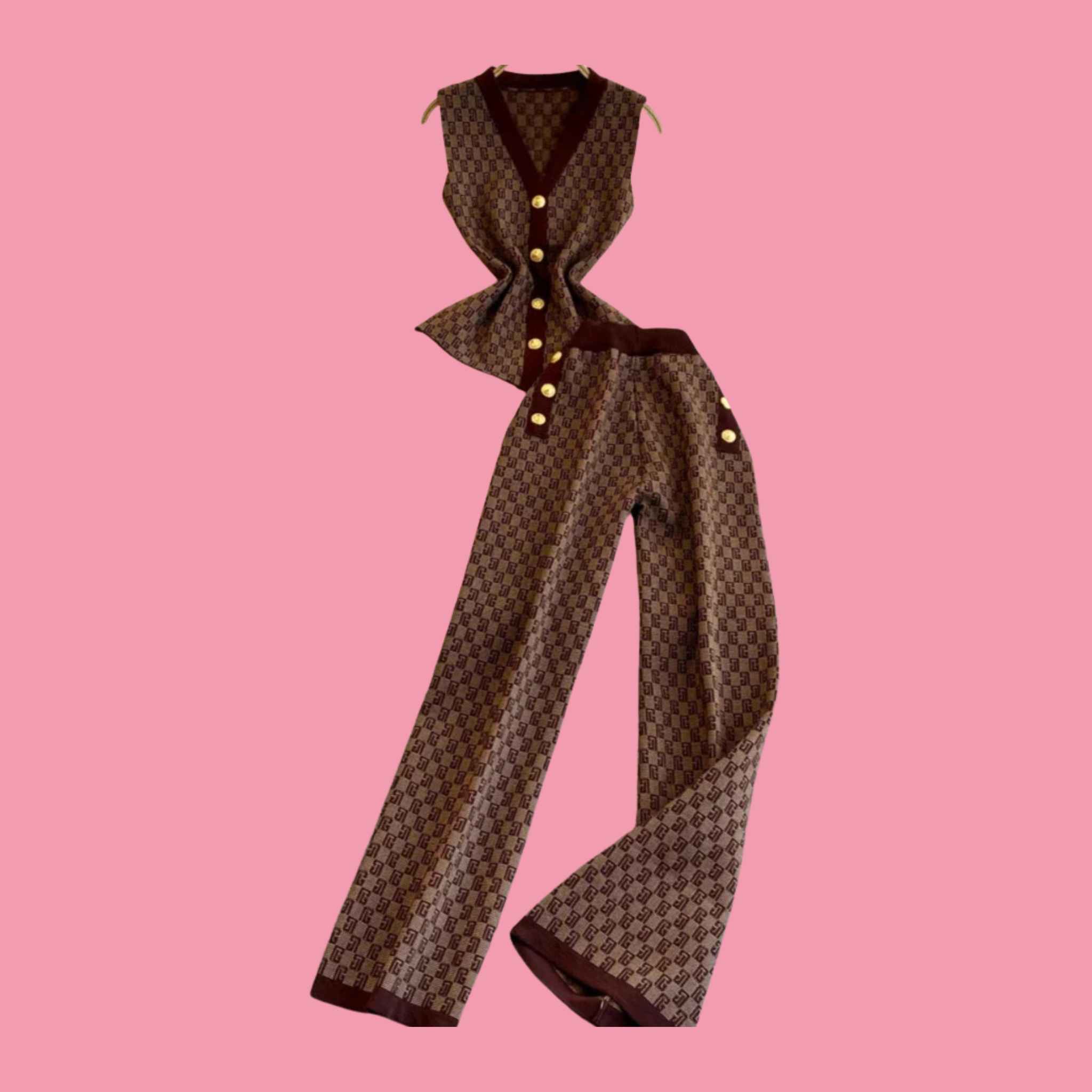 Discover effortless style with this delightful vintage two-piece set! The sleeveless V-neck tank pairs perfectly with high-waisted wide-leg pants for a look that's both comfortable and chic. Featuring a fun monochromatic printed design, this knitted ensemble brings personality to your seasonal rotation. Dress it up or down—this versatile set is your new go-to for casual brunches, weekend adventures, and everything in between. Comfort meets vintage charm in one fabulous package.