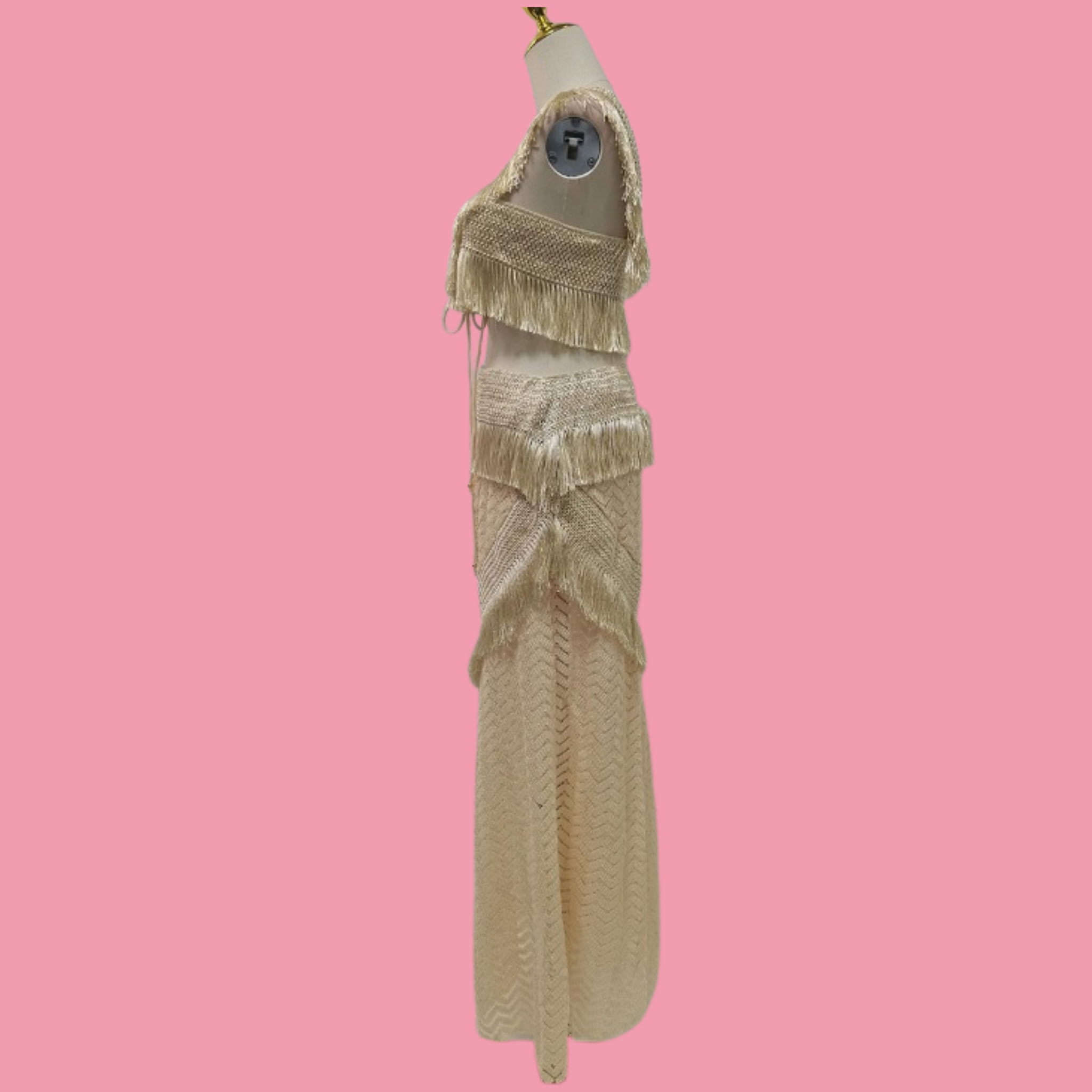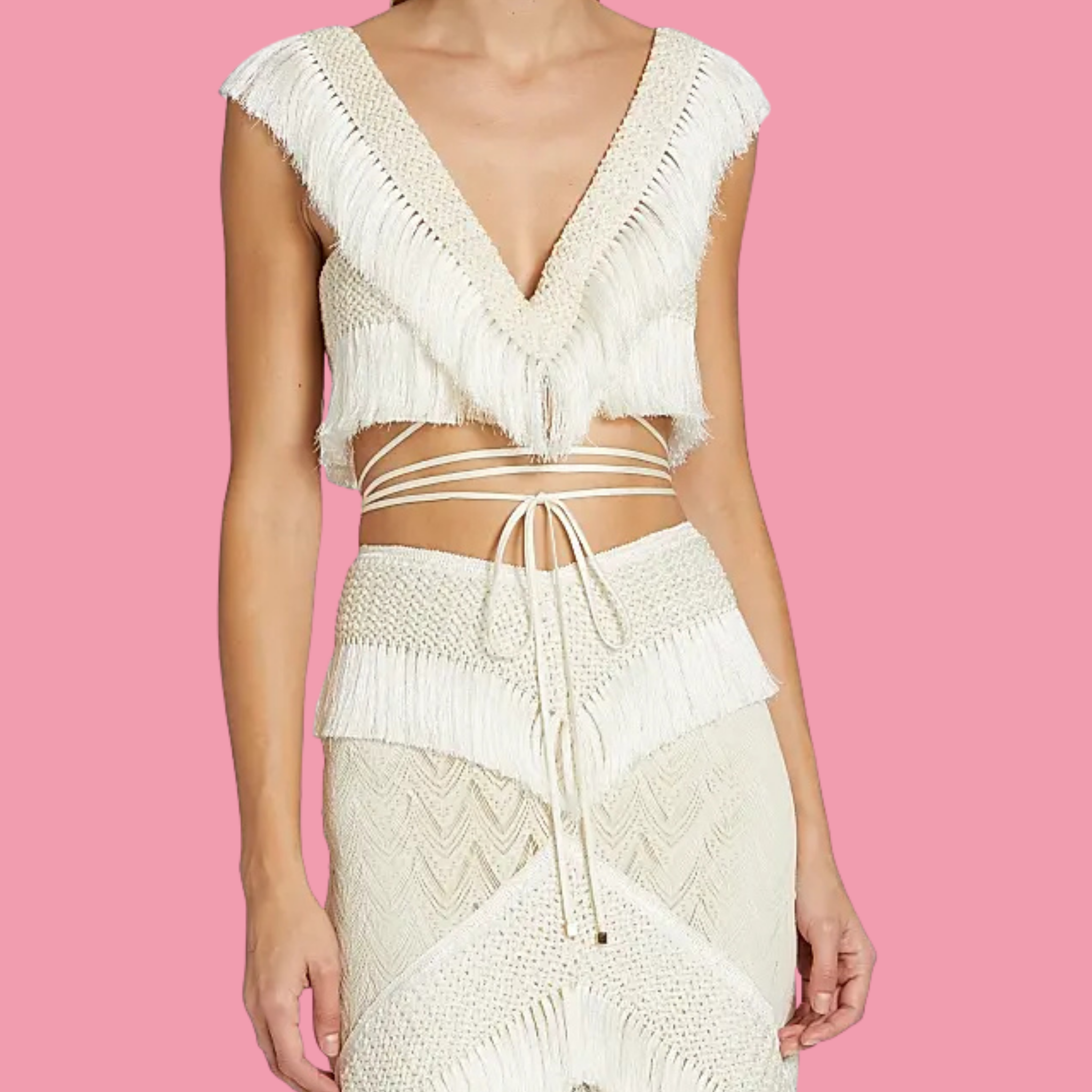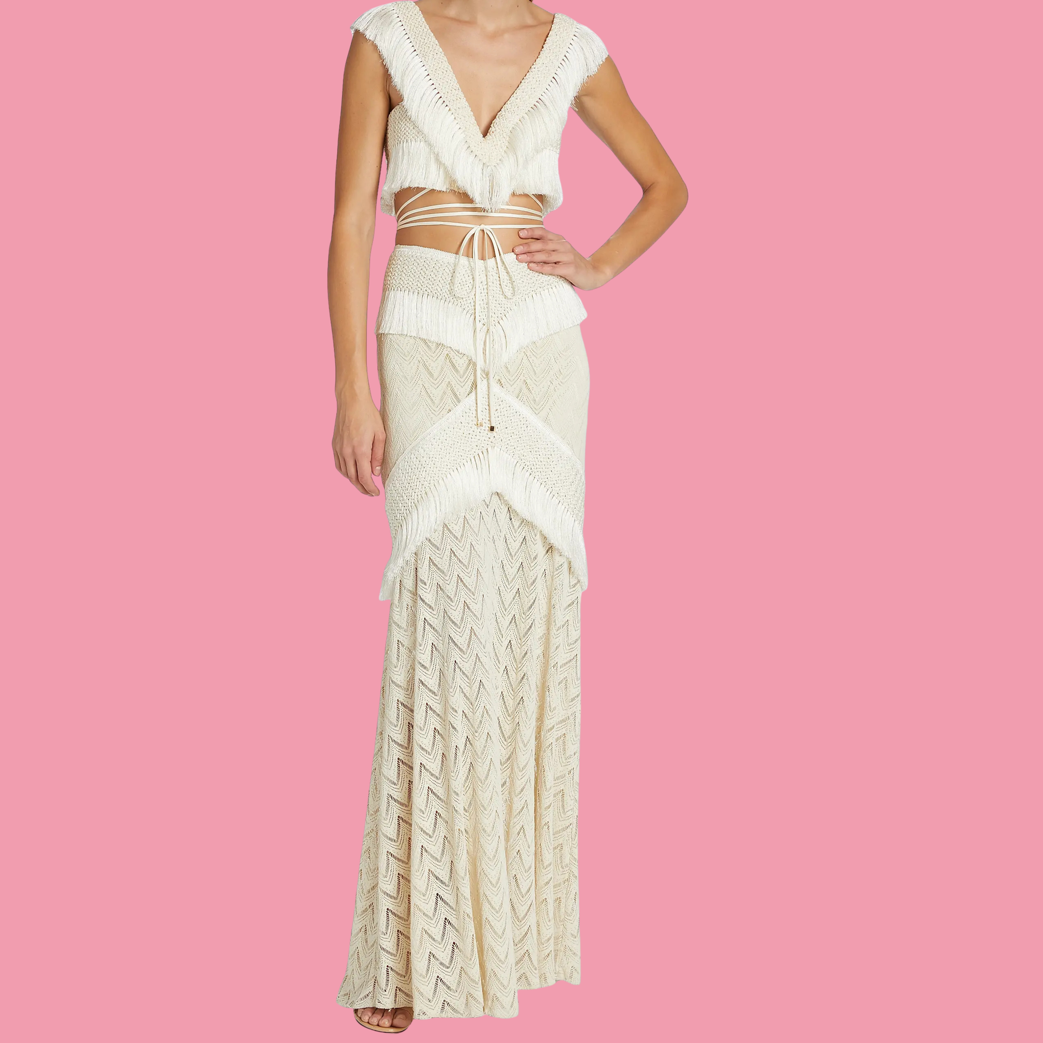 Ultra-cropped sleeveless top featuring tonal fringe detailing and a wraparound self-tie closure. This versatile three-piece swimsuit set includes a coordinating high-waist bottom and a flowing maxi skirt with matching fringe trim, all in soft beige. Perfect for beach days or resort wear, this set offers multiple styling options in one cohesive collection.