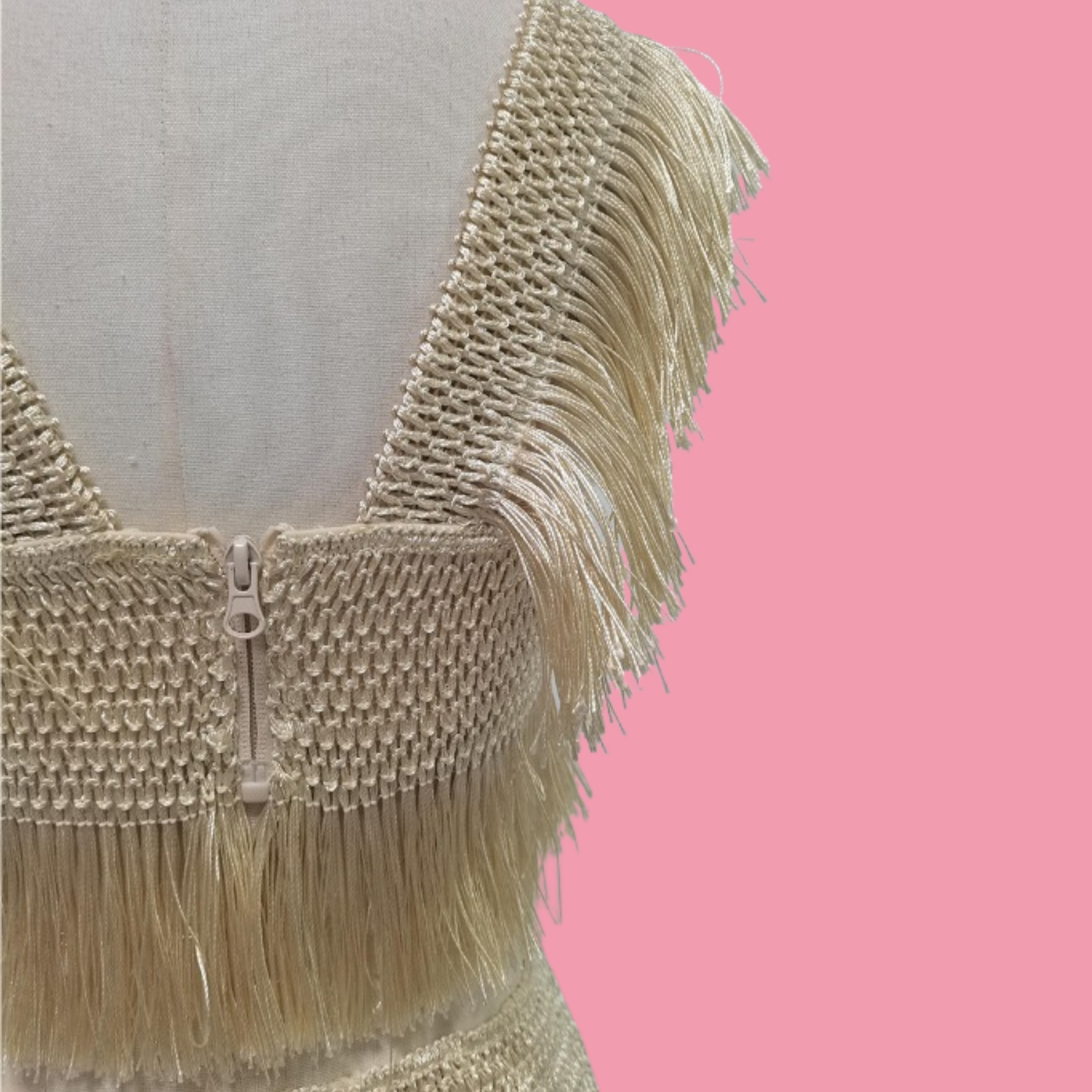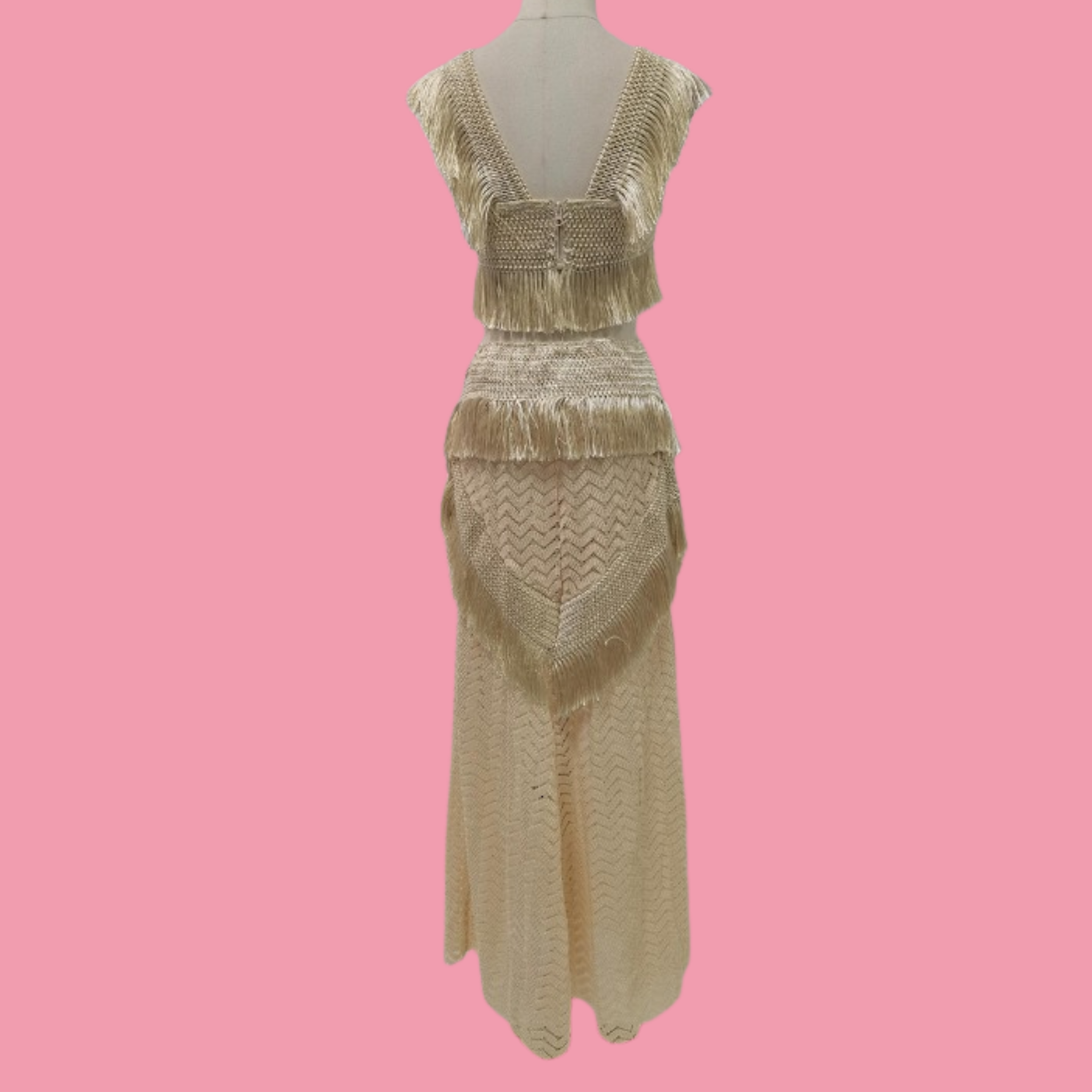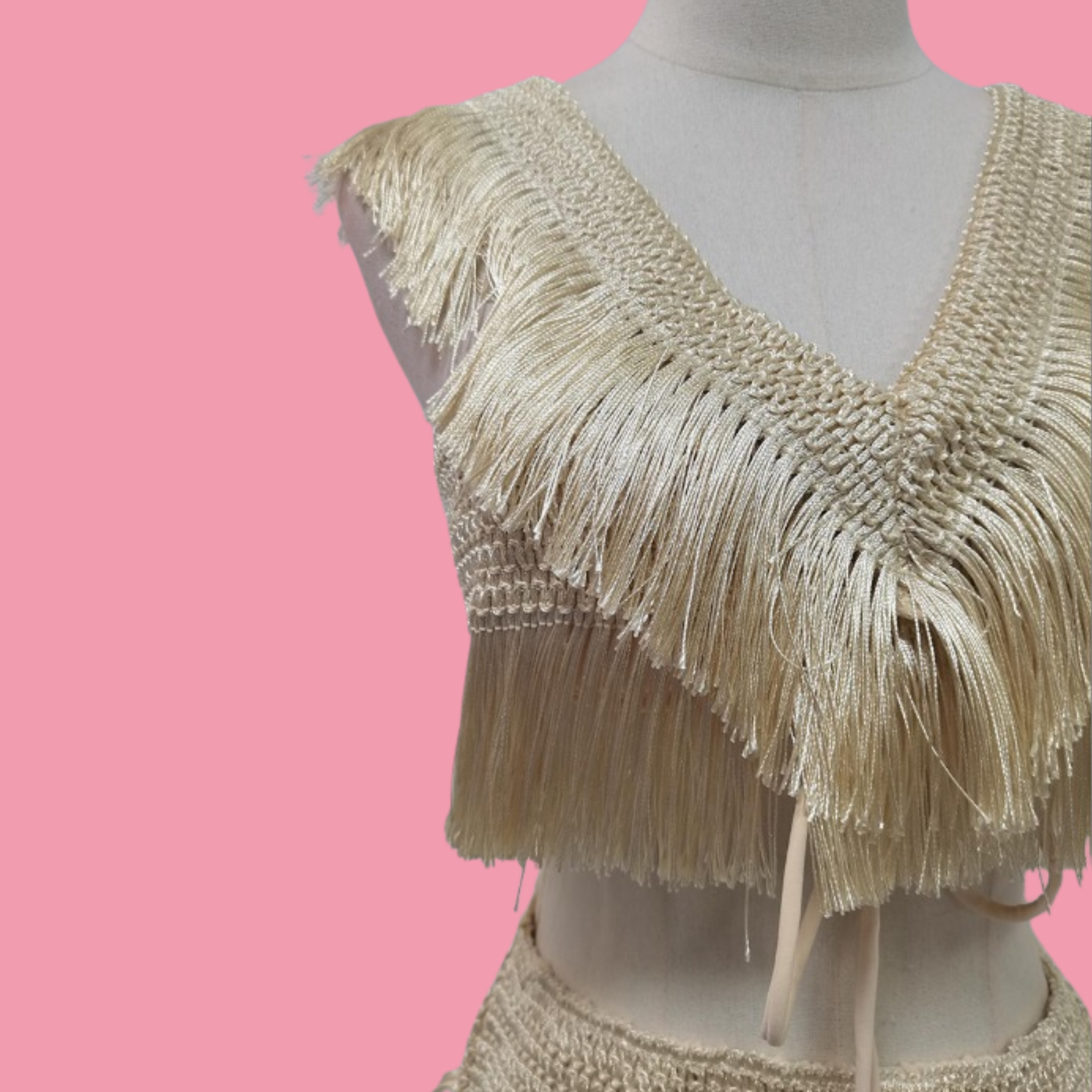 Ultra-cropped sleeveless top featuring tonal fringe detailing and a wraparound self-tie closure. This versatile three-piece swimsuit set includes a coordinating high-waist bottom and a flowing maxi skirt with matching fringe trim, all in soft beige. Perfect for beach days or resort wear, this set offers multiple styling options in one cohesive collection.